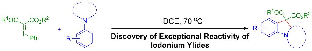 碘叶立德是一类用途广泛的功能有机分子合成试剂,特别是作为产生卡宾物种的前体得到了有机化学家的持续关注与研究。但是,一个极大困扰碘叶立德化学研究领域进一步发展的难题是如何发展碘叶立德参与的基于单电子转移过程的新反应模式。最近,王瑶教授课题组为解决这个难题提供了崭新的思路,发现了碘叶立德全新的反应模式,揭示了碘叶立德在活化胺方面具有其它有机试剂无法比拟的独特性,这个工作更广泛的意义是为有胺类、醚类等多种物质参与的新反应体系的设计和发展开辟了一条蹊径。《Angew. Chem.》近期报道了这一研究成果(Direct Cyclization ofTertiary Aryl Amines with Iodonium Ylides. Angew. Chem. Int. Ed. 2018,57, DOI:10.1002/anie.201800389.)