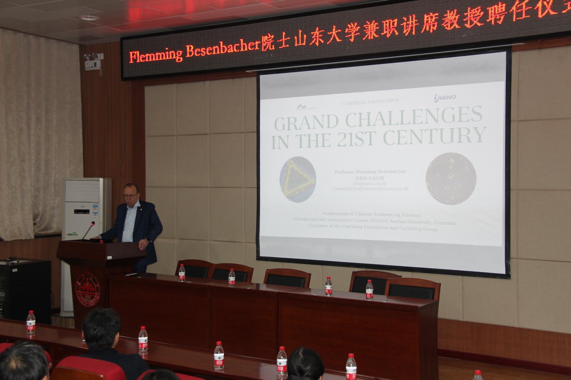 仪式后,Flemming Besenbacher教授做客胶体与界面化学讲坛,做了题为“Grand Challenges in the 21st Century”学术报告。报告中,Flemming Besenbacher 教授列举了当前全球面临的危机与挑战,比如环境污染、能源枯竭、医疗健康等,并重点强调了应用科学技术来解决当前问题的策略和方法,进而提出“education 4.0”的新工科教育理念,认为未来工科教育的发展应该更多的以解决全球问题为导向,打破专业壁垒,鼓励多学科交叉的新教育模式。在提问环节,同学们就自己感兴趣的问题积极提问,Flemming Besenbacher教授院士认真、仔细地给出了自己的解答。万象城awc体育部分教师、研究生听取了报告。