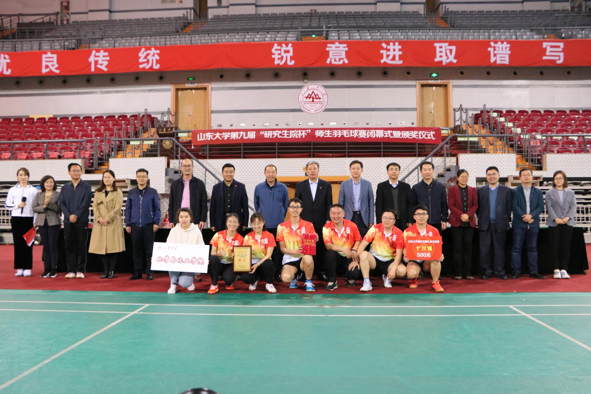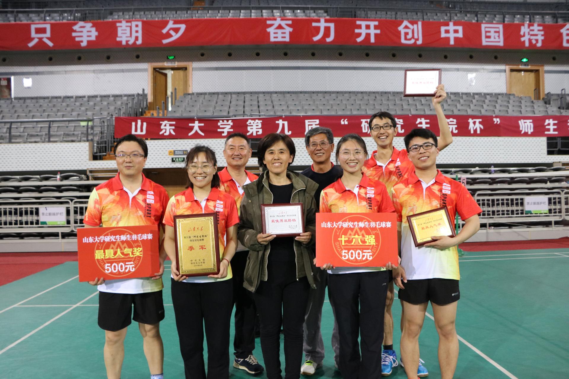 4月28日下午,万象城awc体育第九届“研究生院杯”师生羽毛球赛在中心校区体育馆圆满结束,万象城队员一路过关斩将,荣获季军的好成绩,同时王明刚、吕永胜两位老师当选“最佳男双搭档”,万象城的助威团摘得最具人气奖。