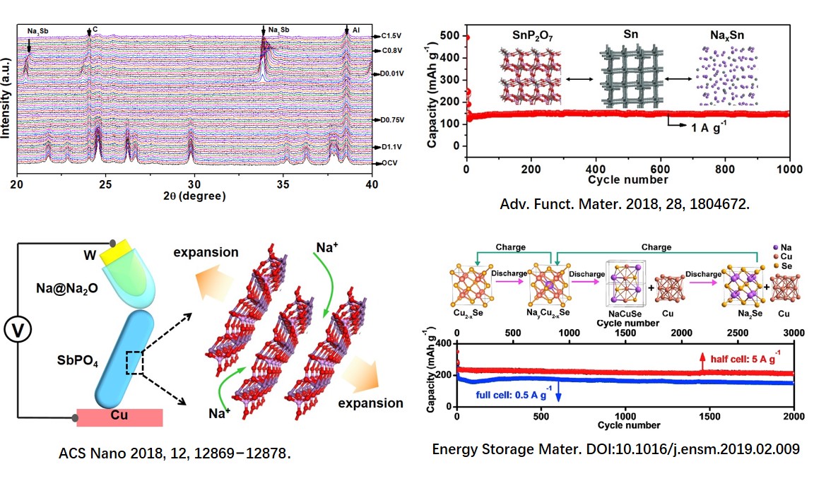 万象城钱逸泰院士团队杨剑教授课题组近年来在钠离子二次电池研究方面取得新成果。围绕着合金机制钠离子电池负极材料的循环稳定性提升和新材料电化学机制研究方面,取得了系列研究进展。1. 发展聚阴离子的缓冲效应来稳定多种合金机制电极材料的电化学性能,发现聚阴离子对M-O转化反应的促进作用,并利用原位/离位电化学联用技术和第一性原理加以解释。相关成果发表在ACS Nano, 2018; Adv. Funct. Mater., 2018,并被nyxr- home.com,nanoer.net,www.sdchem.com.cn,www.cailiaoniu.com等网站专题报道。2. 揭示了硫族化合物的充放电反应机制,实现了无需炭包覆、预钠化和预活化,全电池即可长寿命循环(2000圈)。相关成果发表在Adv. Funct. Mater. 2017, Energy Storage Mater. 2019, Mater. Today Energy 2018上,并被Materialsviewchina.com, nyxr-home.com,sciencetrends.com等网站专题报道。