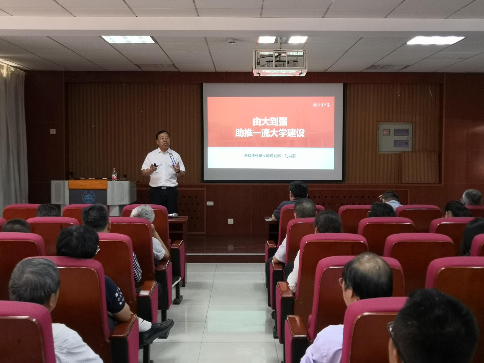 5月23日,化学院在生物北楼一层报告厅举办首期“政策化+”校院对接论坛。学科建设与发展规划部刘洪渭部长受邀作了题为《由大到强 助推一流大学建设》的专题报告,并就“双一流”建设及强院兴校等有关问题与化学院教师代表进行了互动交流。学院各研究所(中心)所长(主任)、党支部书记,各学科学术带头人、学术骨干和教师代表、全体行政管理人员等参加了此次活动。论坛由院长郝京诚主持。