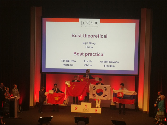 7月19日至29日,第51届国际化学奥林匹克竞赛(IChO)在法国巴黎举行,中国代表队取得优异成绩,斩获三枚金牌、一枚银牌,并分别获得个人总分第一、理论和实验分项成绩第一共三项特别奖。
