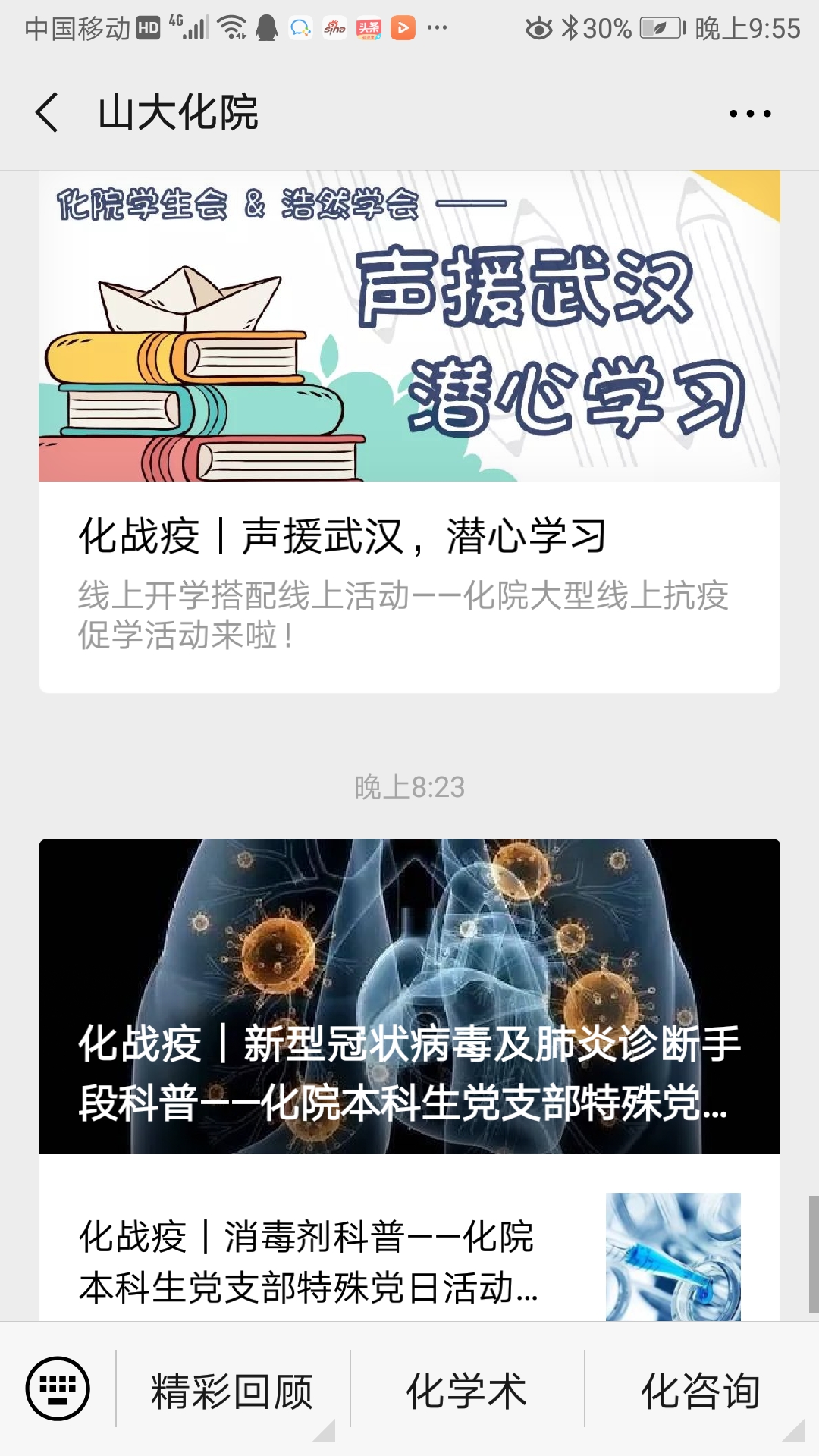 发挥优势,线上活动声援武汉。化院本科生党支部开展了三期特别党日活动,在微信公众号进行推送,其中一期为“声援武汉,共抗疫情”,党员与入党积极分子将自己对武汉抗疫一线白衣天使们的敬意化作一首首发自肺腑的小诗,一段段深情的语音,汇集起对一线工作者和武汉人民的关心与祝福,目前正联系渠道准备发往武汉前线;另外两期内容是发挥专业优势,开展病毒、荧光检测、消毒剂等相关知识的科普宣传,带领大家了解新冠病毒的特点及肺炎诊断手段。学生会收集了全院各班各省份同学想对武汉抗疫一线工作人员说的话,那一段段鼓励的文字、一句句殷切的问候,通过微信公众号,传递着化院学子对武汉抗疫的必胜决心和对一线战士深深的敬意与关切。浩然学会社团与化院学生会联合举办的“声援武汉,潜心学习”线上抗疫促学活动开辟了为武汉加油的新方式,将收集的视频与音频通过学校发送到武汉抗疫一线,送去化院学子的关心与敬意。