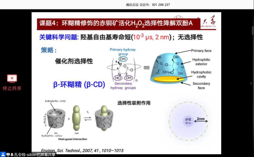 讲座伊始,主持人首先对占金华教授和孔令帅的学习工作经历、研究方向及研究成果等向大家做了简要介绍。在孔令帅的演讲中,他首先对环境矿物材料及其研究意义进行了简述,并向大家详细介绍了他所做的四个研究课题情况,包括黄锡矿活化过二硫酸盐降解双酚A、富氧空位红锌矿活化过一硫酸盐降解双酚A、方镁石活化过一硫酸盐降解双酚A、环糊精修饰的赤铜矿活化H2O2选择性降解双酚A;最后,他对自己的研究工作进行了简要总结。