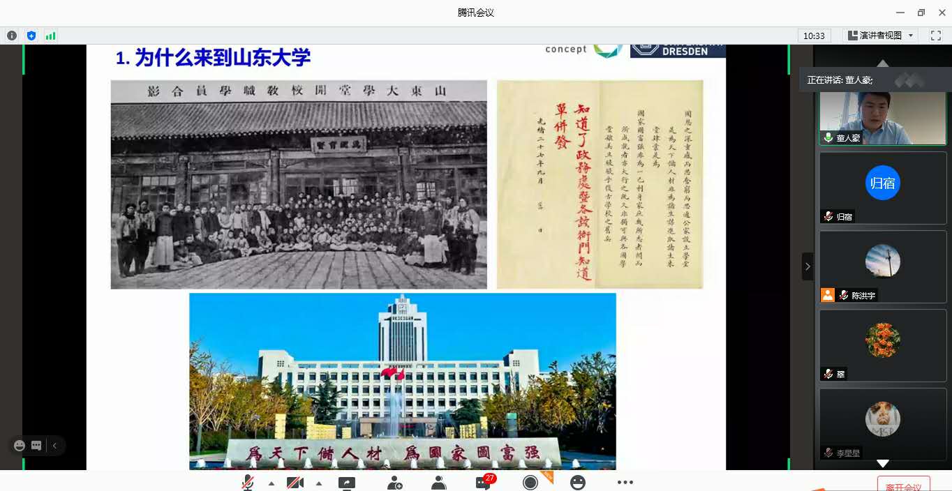 举办校友见面会,提高学生专业自豪感。学院邀请了2004级优秀校友、英国皇家化学会JMC期刊国际评审会成员、德国化学会会员、博士生导师董人豪举办线上“校友讲坛”。董人豪从“为什么来到山大?”“怎样迎接大学生活?”“如何开展学习和研究”三个问题入手,鼓励新生们树立远大理想,带着兴趣、问题去面对大学新生活,提高自身素质,尽快融入山大化院大家庭之中。他与新生们还进行了积极互动,回答了新生们提出的学习、生活、科研相关的问题。校友的成就和引导,极大地促进了同学们的专业兴趣