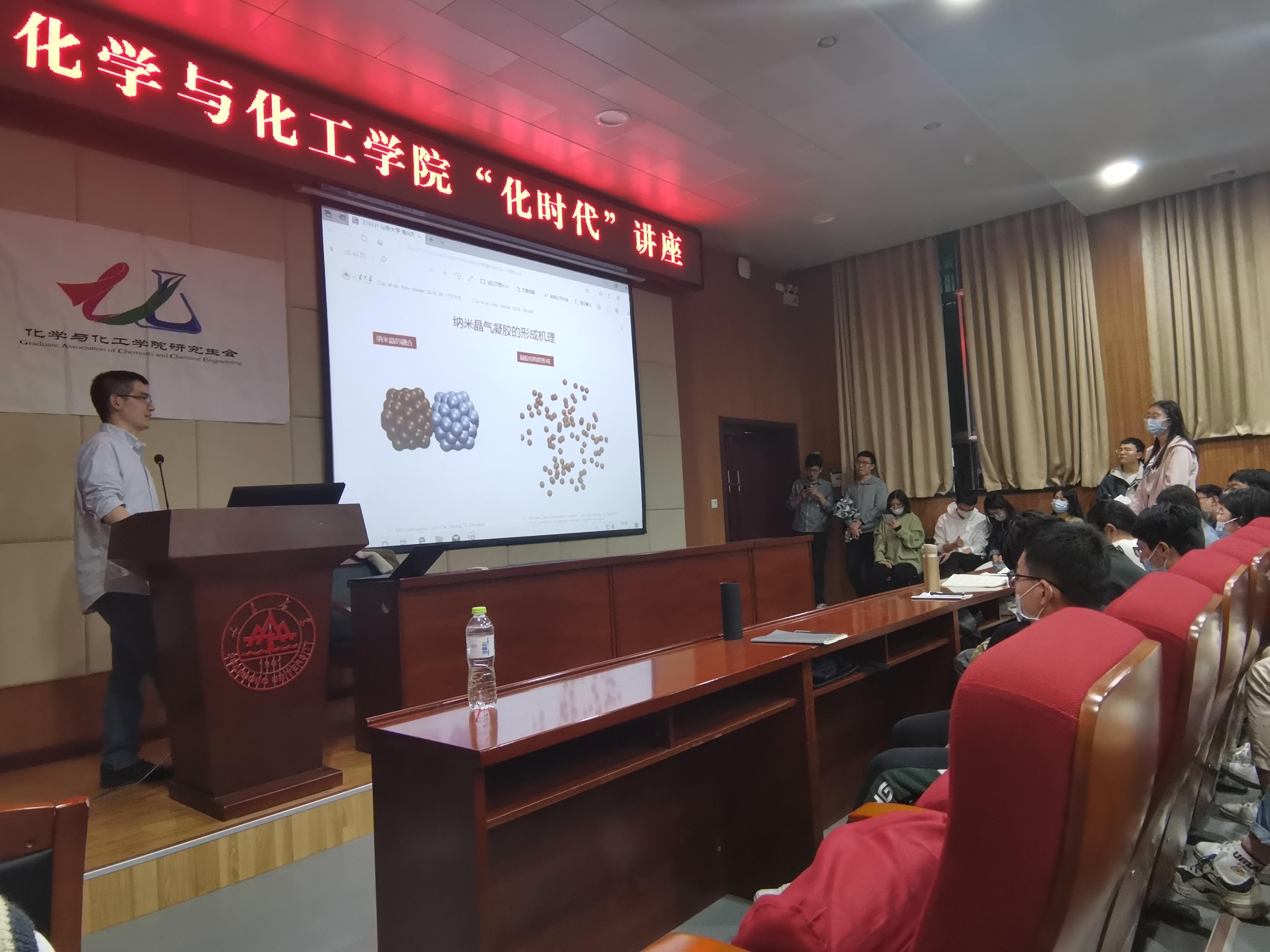 蔡彬教授向同学们介绍了其在研究生阶段及博士后期间的部分研究成果,讲述了电化学技术及应用、基于电化学催化的可持续能源策略和新型电催化剂研究策略;他还围绕金属及金属氧化物的纳米晶气凝胶及氢氧化镍基金属有机框架在电催化方面的研究进行了讲解,详细阐述了纳米晶气凝胶的形成机理、三种制备纳米尺寸气凝胶的策略、如何对金属氢氧化物有机框架(MHOFs)进行电子结构的调控,使M-O团簇稳定在异相催化体系等内容。