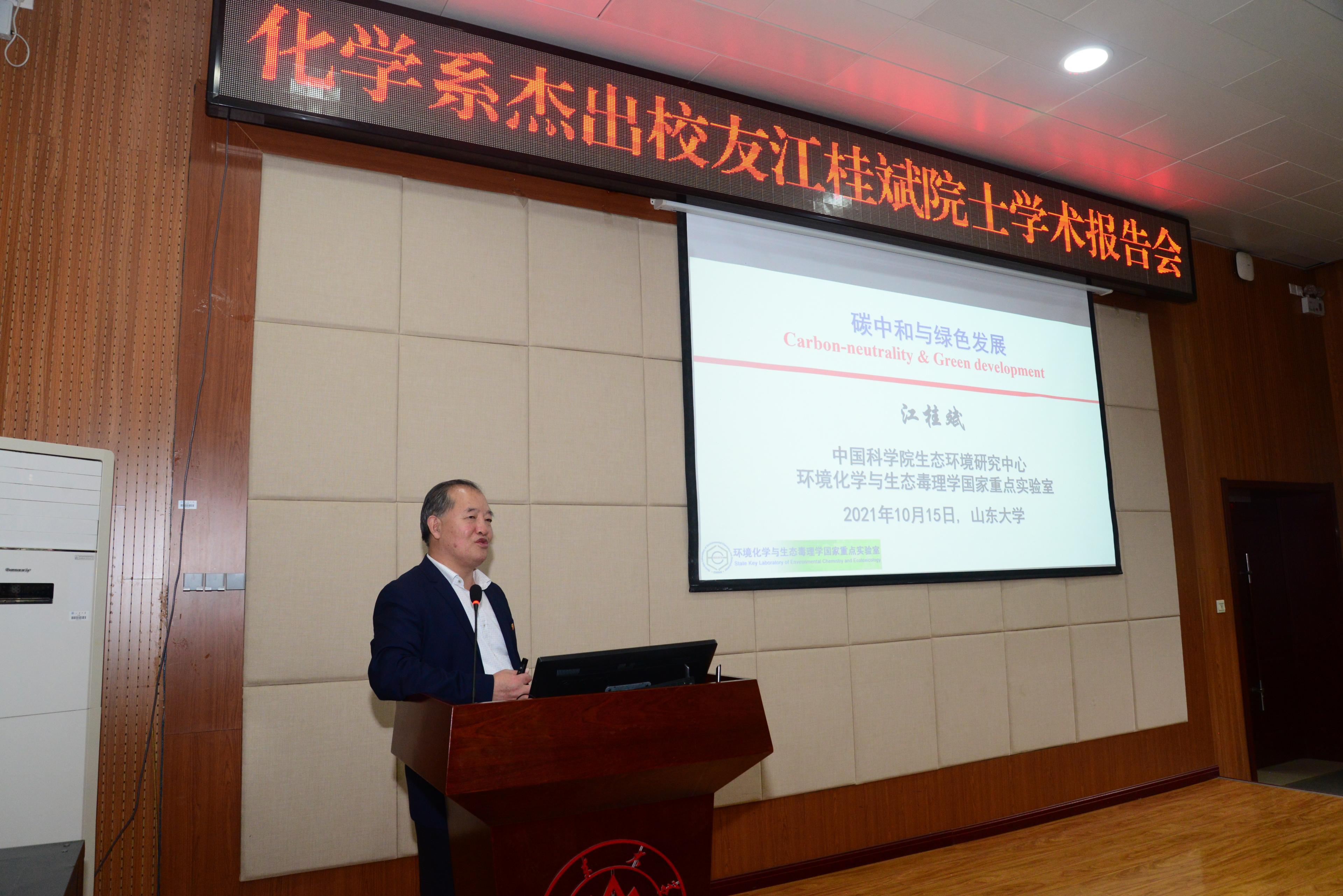 江桂斌院士满怀深情地回忆了当年在万象城awc体育学习时的美好时光,对万象城awc体育发展前景表达了美好祝愿。在报告中,他深刻阐述了国家制定“碳达峰和碳中和”政策的源头、意义和解决方案。从“全球气候变化的一些观察”“碳中和-我们准备好了吗”“碳中和对污染防治之影响”三个方面,深入浅出地介绍了“碳达峰、碳中和”时代背景、学术意义和国内外应对气候变化的举措。结合我国实现“碳中和”目标面临的挑战,展望了这一目标进程中环境污染防治领域承载的影响和未来发展趋势。