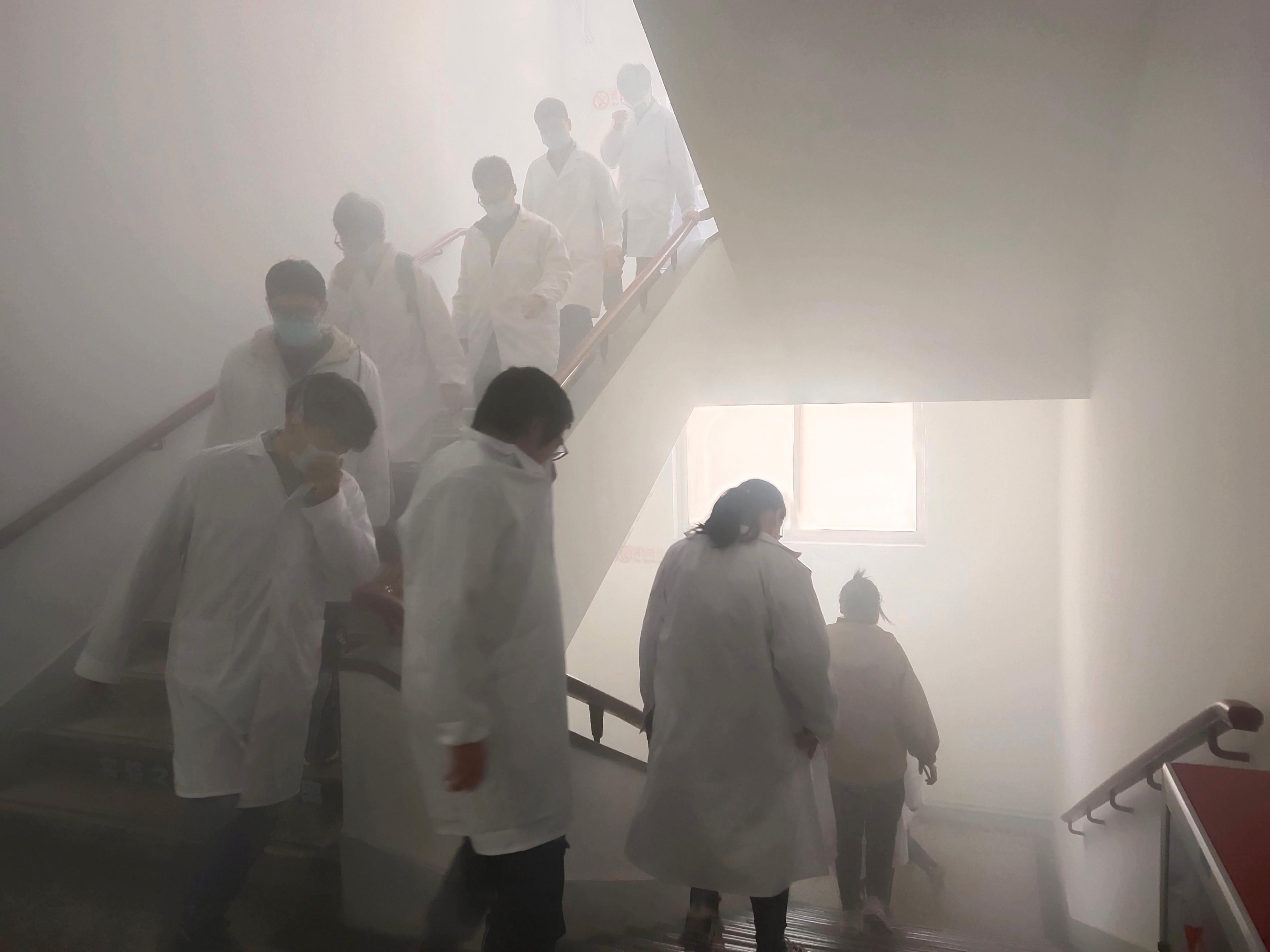 “化学楼出现火情,请同学们做好防护,有序撤离!”随着广播的响起,演练正式开始。化学老楼中冒出滚滚浓烟,楼内消防报警系统第一时间发出警报,一场真实场景下的消防疏散演练随即展开。在学校公共安全平台远程广播引导下,楼内正在上课的师生快速有序撤离到安全区域。在之后进行的消防灭火演练中,公安处负责人向师生详细介绍灭火器的使用方法,并进行了灭火演示,随后同学们分组使用灭火器体验了真实灭火操作。活动结束后,学校公安处安全科科长杜春兴和化学院实验教学中心主任宋其圣分别对本次活动进行了点评和总结。