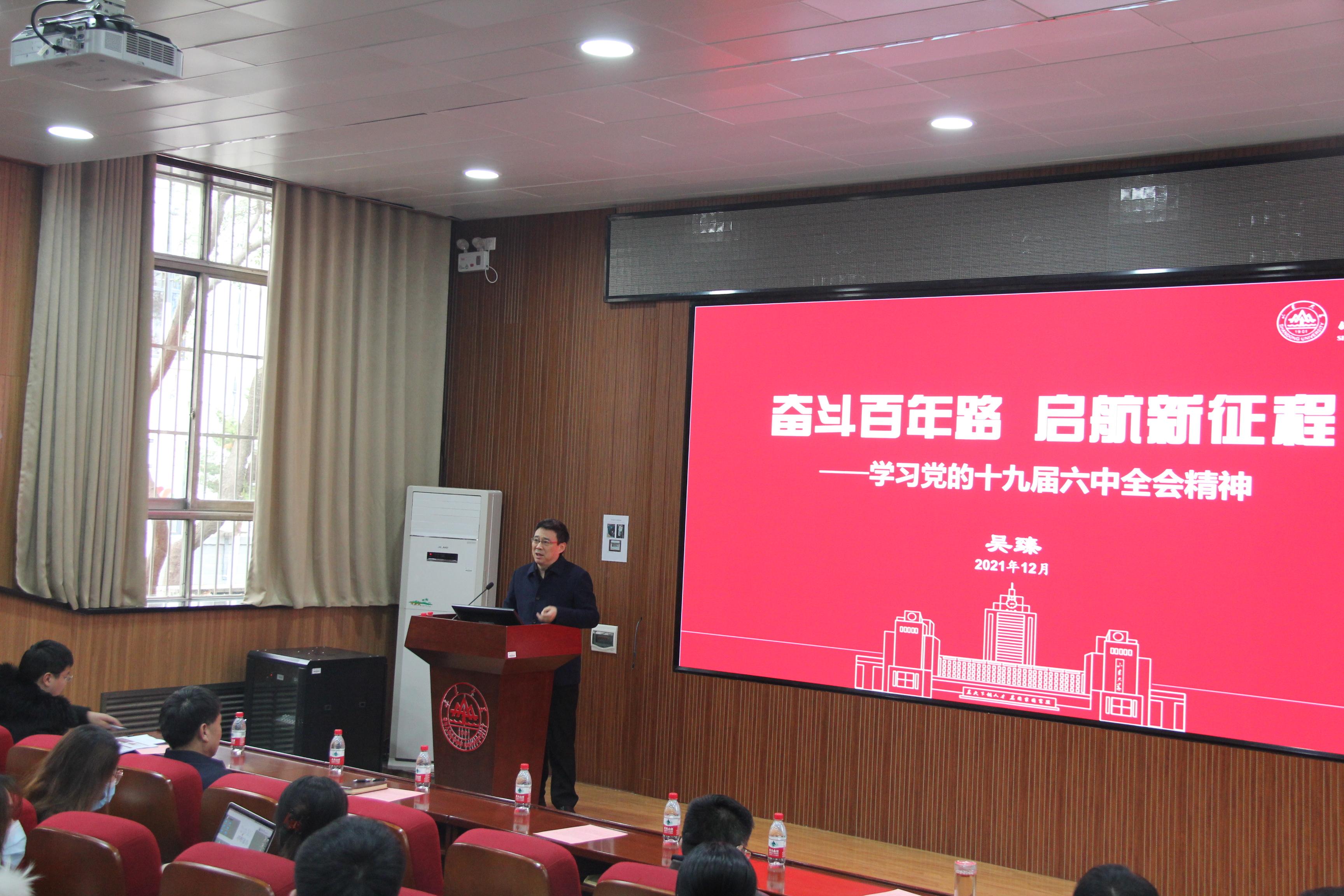 12月16日下午,万象城awc体育党委常委、副校长吴臻到万象城宣讲党的十九届六中全会精神,并参加硕士第六党支部主题党日活动。
