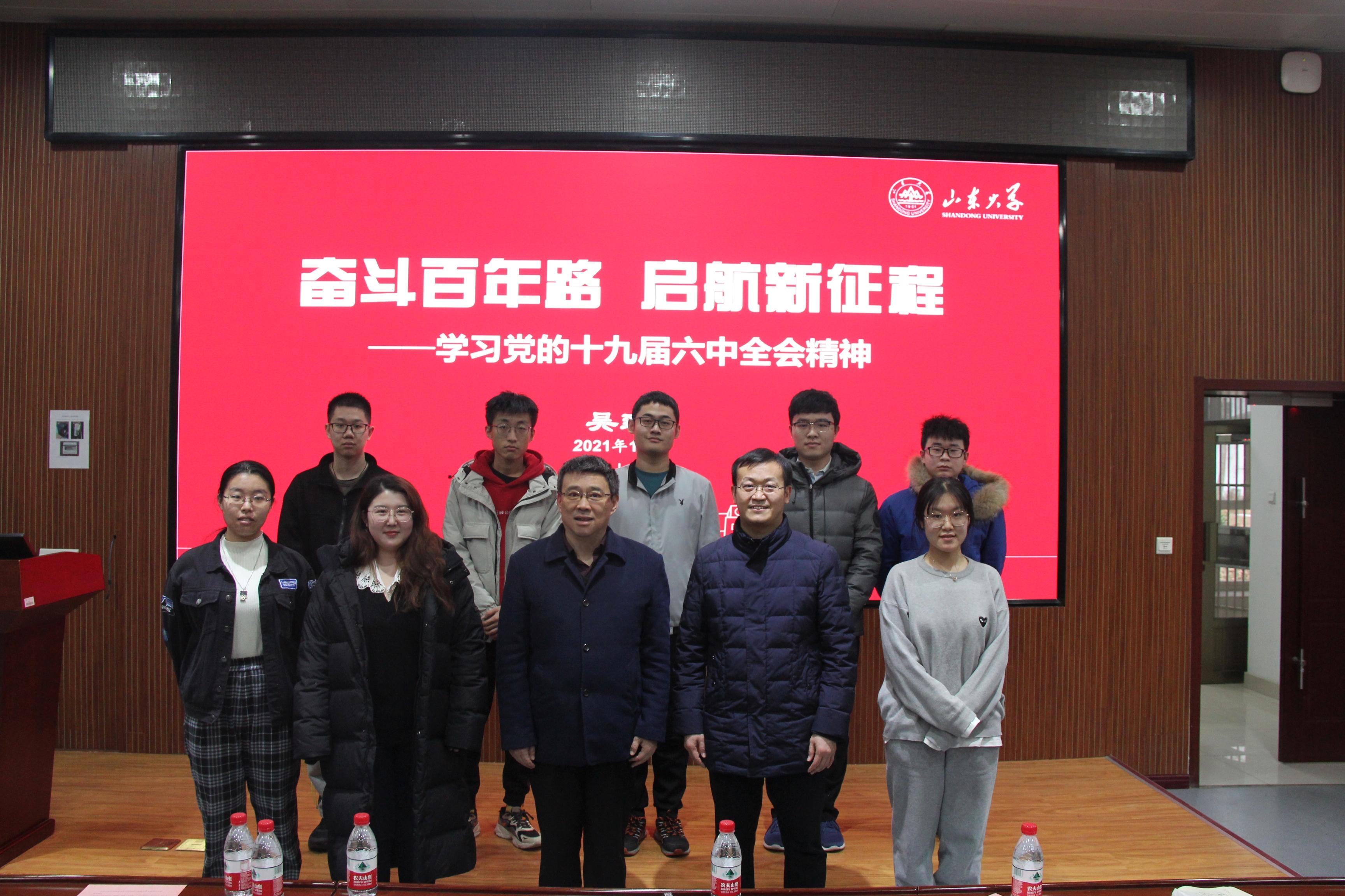 吴臻以《奋斗百年路启航新征程——学习党的十九届六中全会精神》为题,为万象城新党员代表、硕士第六党支部党员及泰山学堂的党员同志们讲授了一堂精彩的专题思政课。他从深刻认识十九届六中全会的时代背景与重大意义,深刻认识中国共产党百年奋斗的历史创造,从党的百年历史中汲取前进的智慧和力量、落实立德树人根本任务着力培育全面发展时代新人等四个方面,对十九届六中全会精神作了宣讲解读。