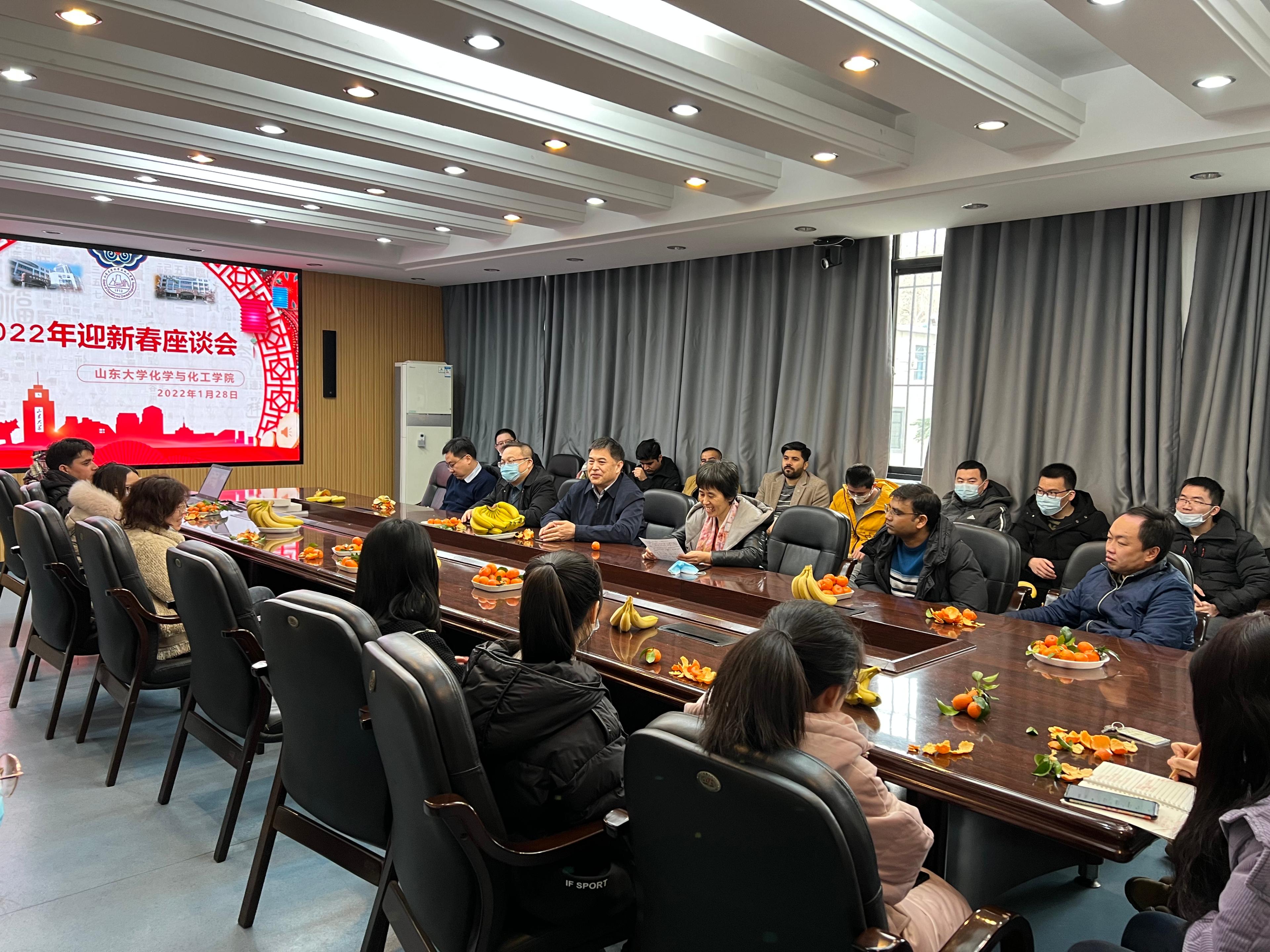 座谈会上,学院领导、老师与留校学生们进行了亲切交谈,了解了留校学生的学习、生活及科研情况和需求。党委书记侯兴合向大家转达了王琪珑院长的新年祝福,并代表学院向留校学生致以亲切的节日慰问,鼓励老师同学们在新的一年继续努力、勇挑重担,为学院“双一流”建设和十四五事业发展贡献力量。陈代荣教授分享了参加山东省第十三届人民代表大会的感受和全国、全省发展面临的新机遇,希望师生们充分把握时代脉搏,认真做好科研,把化学化工学科做大做强。副书记马勇在对同学们表达祝福的同时,强调假期在校期间务必将“安全”二字入心入脑,自觉做好疫情防控,确保春节平顺。青年教师代表孙頔教授、外籍教师Gupta等也祝愿大家新的一年里实现学业、科研双丰收。座谈会现场欢声笑语不断,节日气氛浓厚。同学们一一表达了留校欢度春节的感受和对学校学院的感谢,表示虽然不能回家过年,但在学校也同样感受到了家的温暖。活动结束后,学院为留校学生发放了新春礼盒和疫情防护用品,表达关心和祝福。