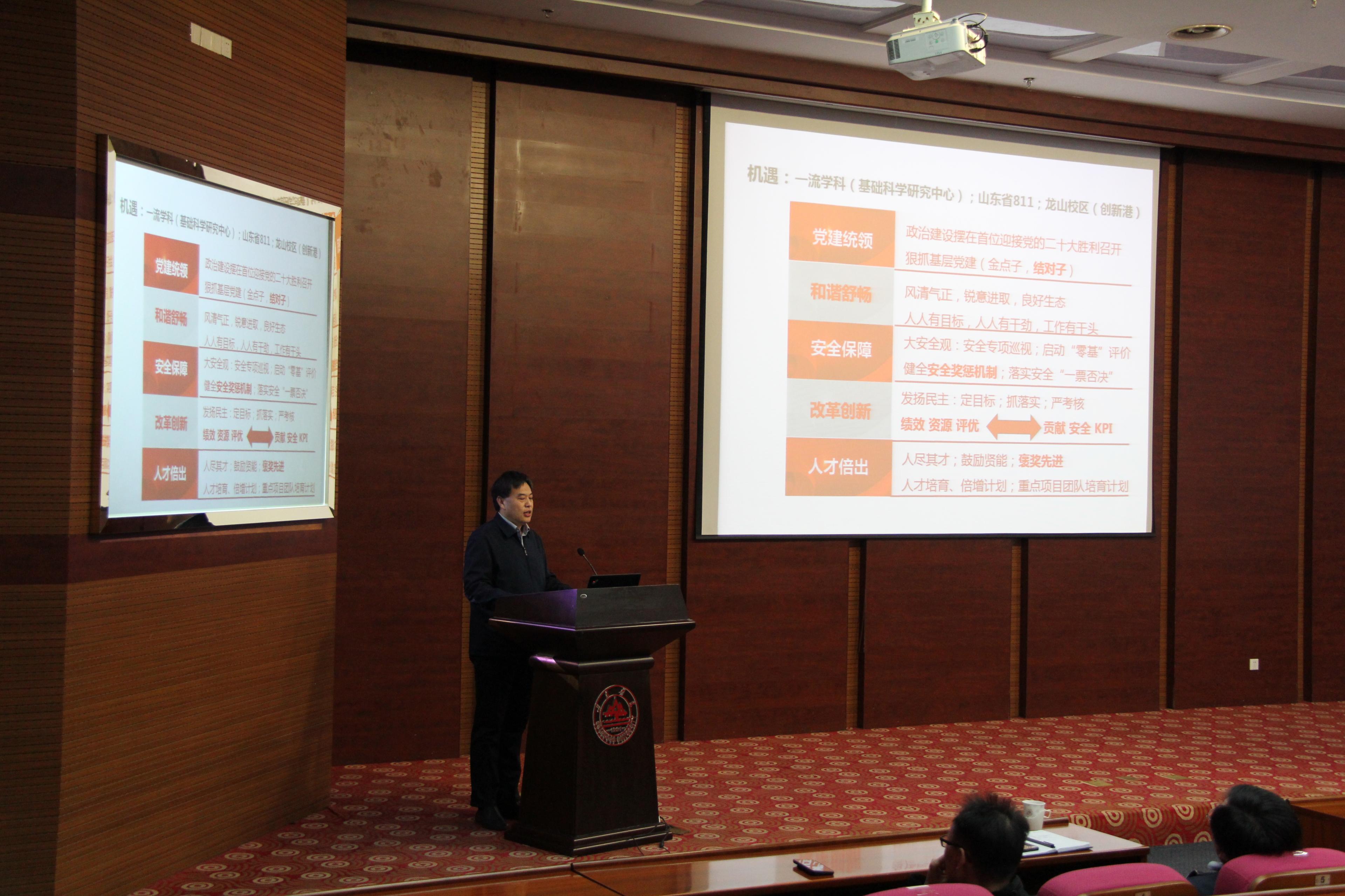 会上,王琪珑从贯彻落实《关于深入推进世界一流大学和一流学科建设的若干意见》,推动学院实现内涵式高质量发展出发,部署学院重点工作。王琪珑指出,面对新的形势任务,学院既要聚势谋远,更要精耕细作,通过全体教职工的努力,展现山大化学学派风范。一要做党建领航的模范,在改革发展、安全稳定、常态化疫情防控工作中要充分发挥学院党委政治核心、党支部战斗堡垒作用、党员先锋模范作用。二要厚植人才成长的沃土,全面总结学院在人才培养上的成功经验,认真落实立德树人根本任务;进一步营造良好的学术生态,提炼学院文化和价值追求,培育建设高水平科研团队。三要打造追求真理的乐园,继续浓厚和活跃学院学术氛围,前瞻布局新兴学科方向,重视培养年轻教师,鼓励和激励开展原创性工作研究。