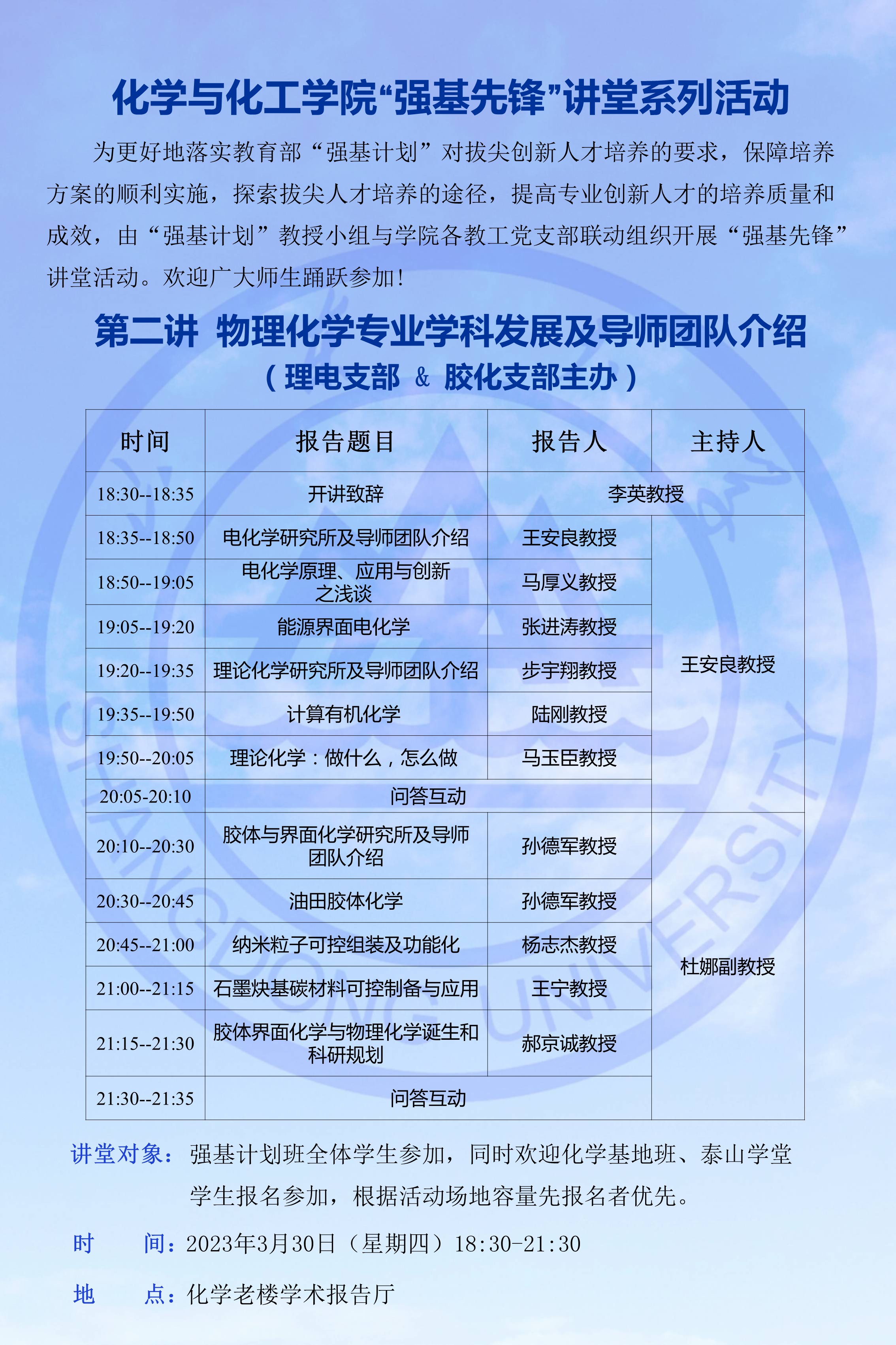 3月30日,“强基先锋”讲堂举行第二场报告会成功举行。学院理电党支部书记王安良、胶化党支部书记杜娜主持报告会,强基计划班教授工作组组长李英教授致辞。电化学、理论化学、胶体与界面化学方向的12位教授出席活动并作报告。强基计划班、化学基地班和泰山学堂化学取向的学生参加报告会。