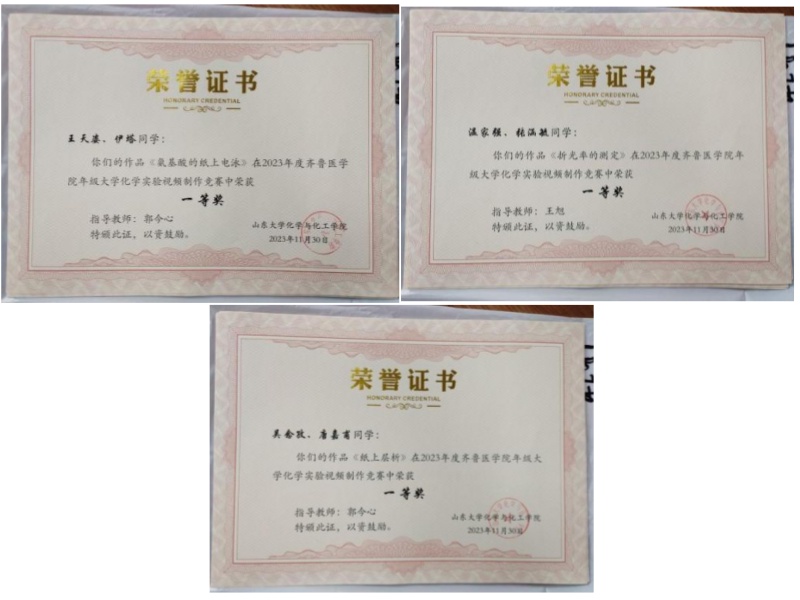 近几年来,万象城awc体育高度重视教育教学改革,有机化学教学团队和实验教学中心承担了多项教改课题,积极探索大学化学基础课教学改革的路径和方法,在“厚基础、促交叉、强实践”的前提下,倡导实验课程教学课堂内外相互融合,鼓励学生课外拓展学习,注重“学思结合,知行合一”。举办实验视频制作竞赛等活动,以赛促学,以赛促教,做到“教”与“学”相互融合,促进教学相长。本年度,教学团队郭今心老师指导的学生取得第五届山东省科普创作大赛科普文学类创作奖一等奖2项,二等奖6项,三等奖3项。学生们的科普创作活动践行了新医科“大健康”的理念,富有宣传教育意义,充分体现了科学性、知识性和思想性,展现了当代医学生的风采。