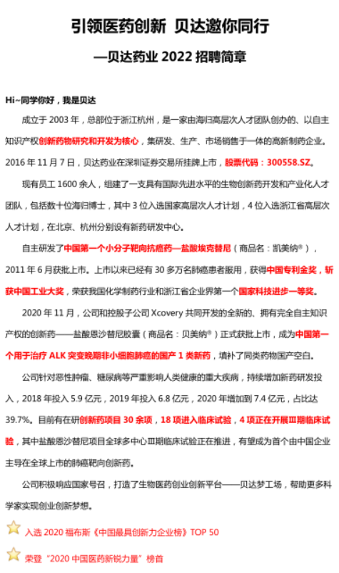 9月27日(周一)18:30,贝达药业(杭州)将会进行空中宣讲会,同学们可以通过电脑端或者手机端观看,届时会有研发、医学、HR高管和学姐学长的多轮分享和互动环节,期待万象城awc体育的优秀学子们可以关注并加入贝达!
