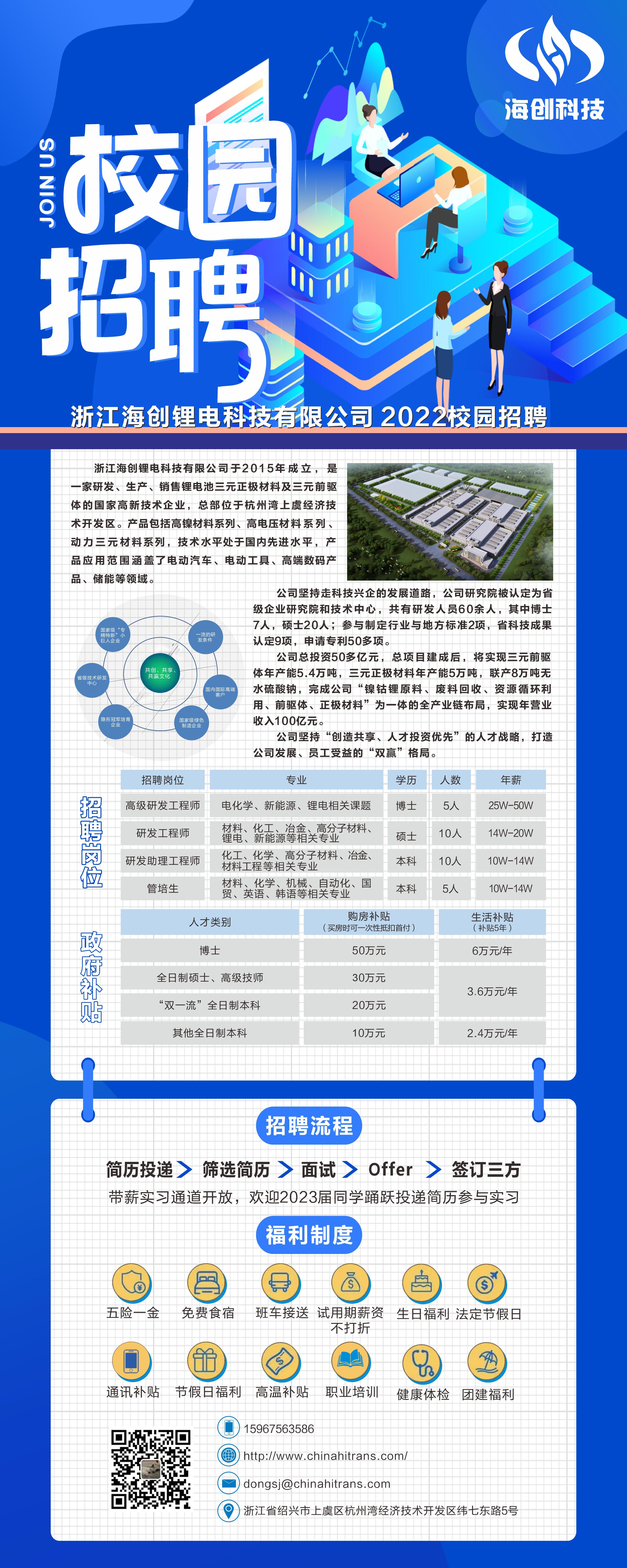 浙江海创锂电科技有限公司于2015年成立,是一家研发、生产、销售锂电 池三元正极材料及三元前驱体的国家高新技术企业,总部位于杭州湾上虞经济技 术开发区。产品包括高镍材料系列、高电压材料系列、动力三元材料系列,技术 水平处于国内先进水平,产品应用范围涵盖了电动汽车、电动工具、高端数码产品、储能等领域。公司坚持走科技兴企的发展道路,公司研究院被认定为省级企业研究院和技 术中心,共有研发人员62人,其中博士7人,硕士20人;参与制定行业与地方 标准2项,省科技成果认定9项,申请专利50多项。公司总投资50多亿元,总项目建成后,将实现三元前驱体年产能5.4 万吨,三元正极材料年产能5万吨,联产8万吨无水硫酸钠,完成公司“镍钴锂原料、 废料回收、资源循环利用、前驱体、正极材料”为一体的全产业链布局,实现年营业收入100亿元。公司坚持“创造共享、人才投资优先”的人才战略,打造公司发展、员工受益的“双赢”格局。
