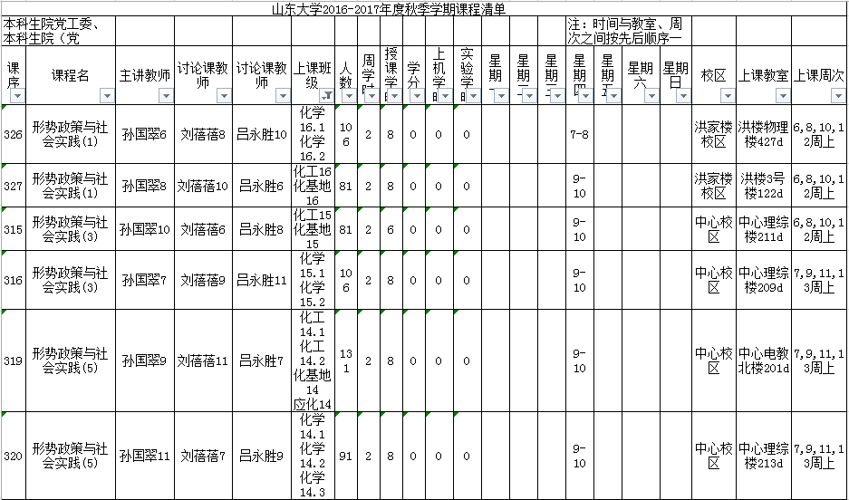 展示题目不限,与主题相关即可,可为主题里的某一部分或某一个论点,展示内容需深刻有意义,需充实有力,有血有肉,小组成员参与性强。请各班学习委员进行协调后,10月12日10:00前,由一位学习委员代表,将一起上课的班级的分组结果汇总后(见附件),发送至sd_hy@sina.cn,未加入小组的同学讨论课成绩为0。请大家提前做好准备,孙国翠老师为讲授课教师,吕永胜、刘蓓蓓老师为讨论课教师,有些班级先进行讨论课再进行讲授课,课程顺序见下。